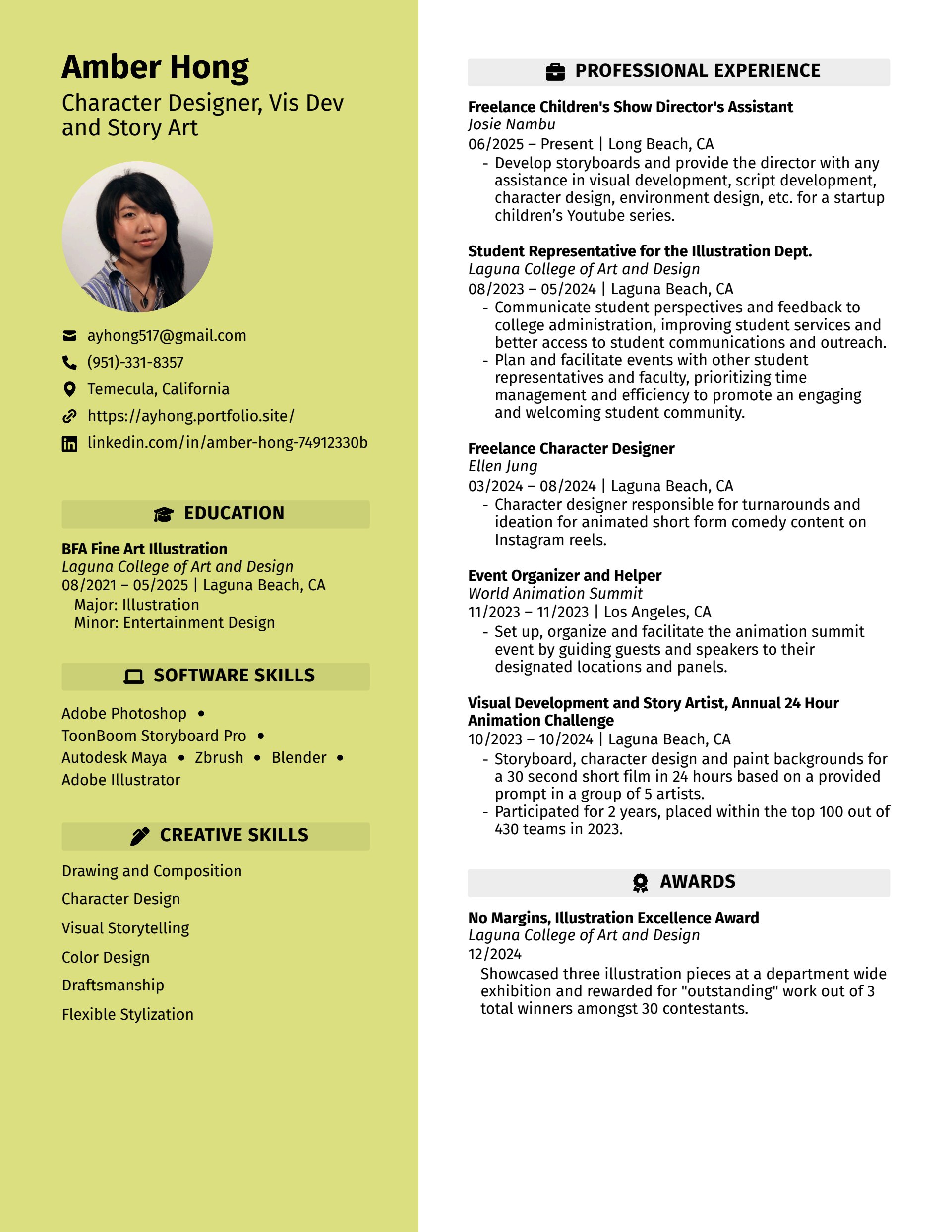 I’m an OC based illustrator, character designer and Vis Dev artist. I graduated from Laguna College of Art and Design with a BFA in Illustration and minor in Entertainment Design in 2025.